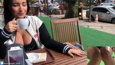 Cette jolie brunette de 18 ans a reçu un pur cadeau de la part de son chéri : un sextoy télécommandé. La meuf au gros nichons doit mettre le joujou dans son string et laisser son mec le commander depuis son mobile. A la terrasse du café, la jeune libertine n'en peut plus de multiplier les orgasmes, quelle délicieuse torture !